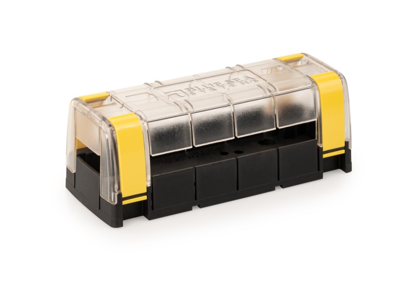 Cover for the BlueSea 4xM8.busbar. The replacement cover insulates completely. Conforms to ABYC insulation standards.